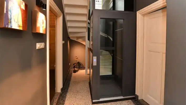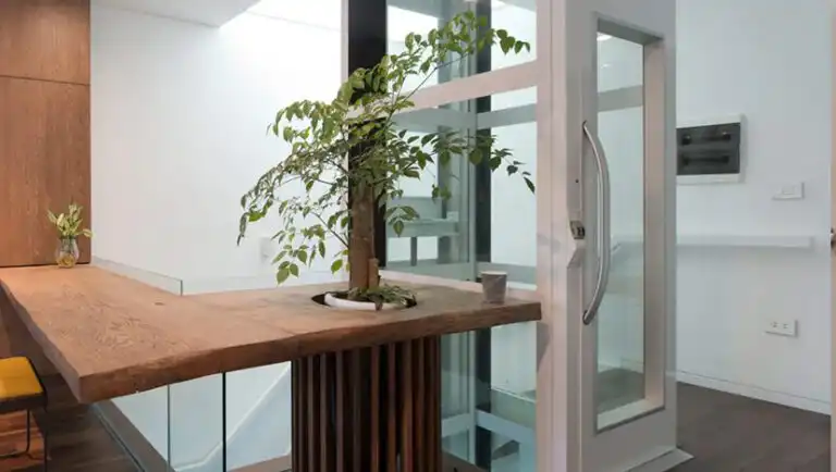 Ο σχεδιασμός που εξοικονομεί χώρο διευκολύνει την ενσωμάτωση του ανελκυστήρα στο σπίτι σας. Εάν έχετε μια κεκλιμένη οροφή στον τελευταίο όροφο, απλώς επιλέξτε μια θύρα αντί για μια πόρτα πλήρους ύψους.